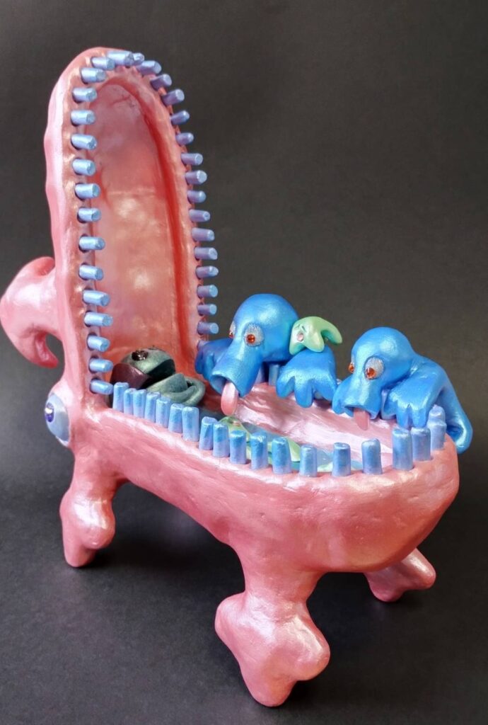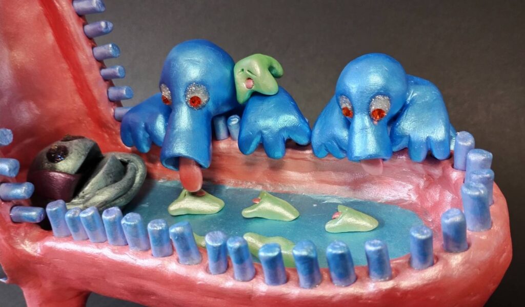 「わあわ」の口の中で楽しく遊んでいる「うまり」と「たるり」に声がけしている「すうと」親子です。